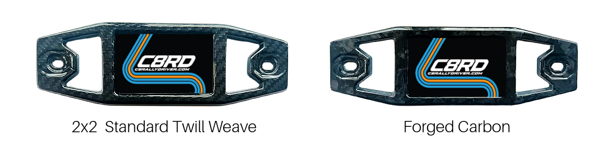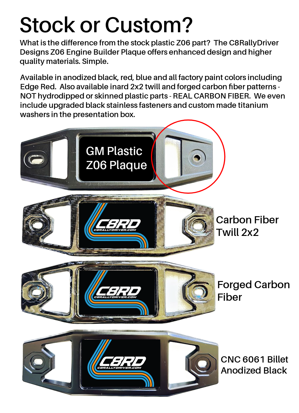 The CARBON FIBER VERSION of the C8RallyDriver Corvette Z06 Engine Builder Plaque is made of either 2x2 twill weave or forged carbon fiber. The 2x2 is a standard industry weave and matches all C8RallyDriver carbon fiber products as well as most manufacturers of high quality aftermarket carbon fiber products.