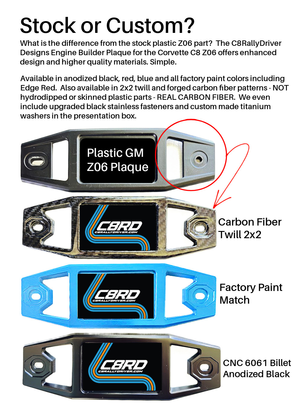 The C8RallyDriver Corvette Z06 Engine Builder Plaque is CNC machined out of high-grade 6061 aluminum. For our 2x2 twill weave and forged carbon fiber Z06 Engine Builder Plaques, please click HERE.